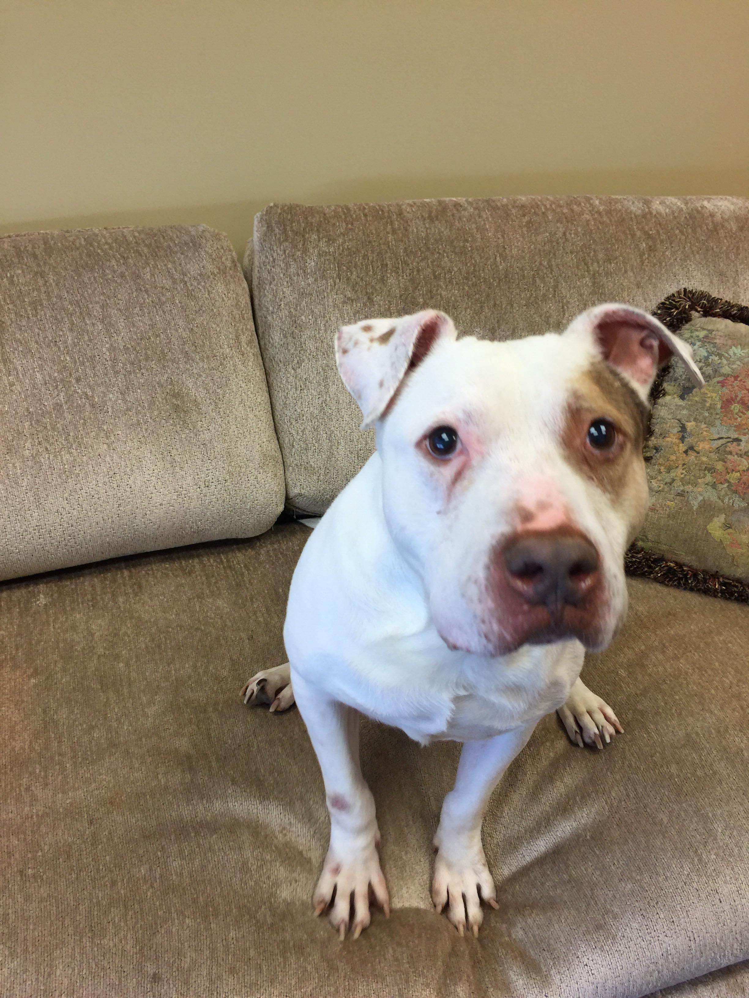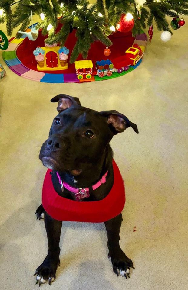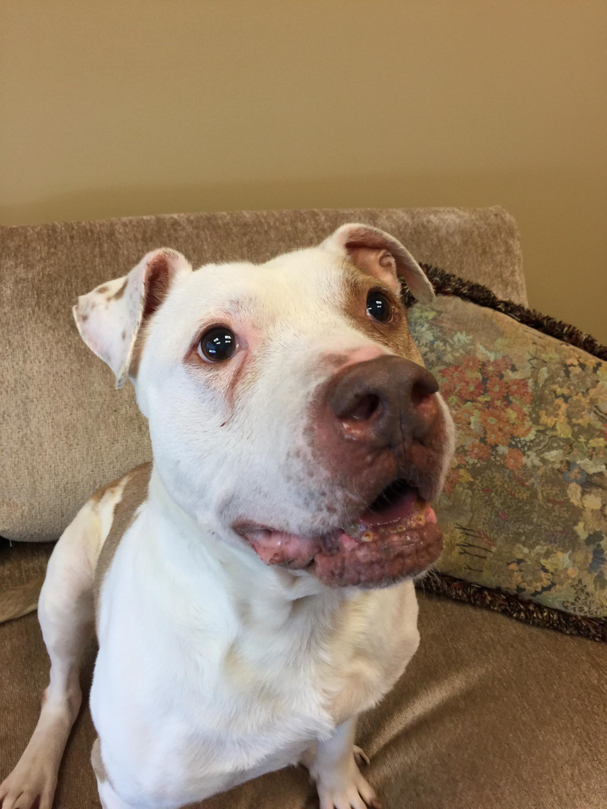 Marcus was adopted out at 4 months but returned by the time he turned 7 months by the family. He had a lot to overcome at that point and has put in the work. He is no longer the frightened puppy and is an outgoing fun loving dog.