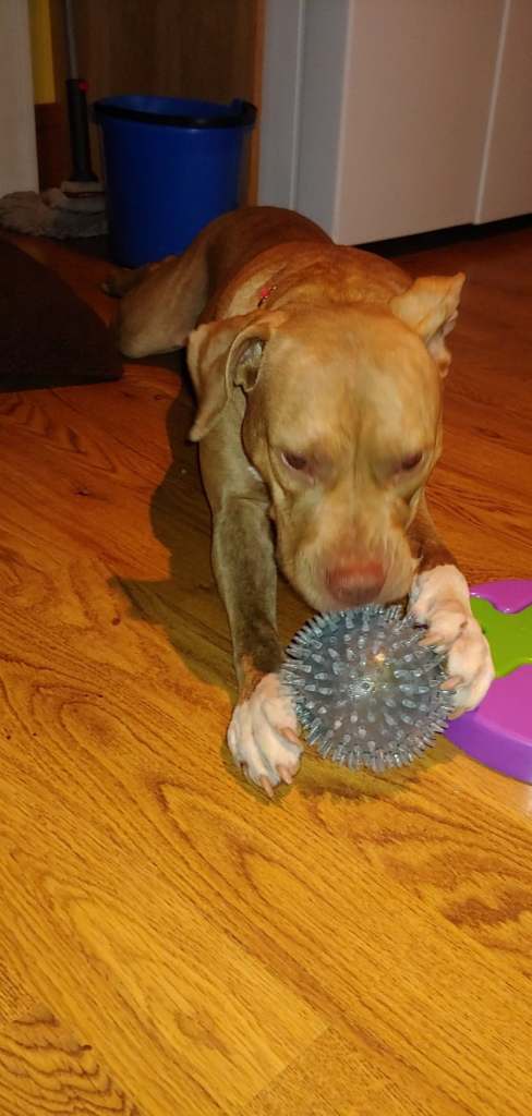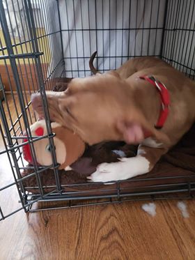Jessie currently lives with a 10-year-old human foster sister and stays in the kitchen area. She does really well at this despite being a high energy dog. She uses her crate for quiet alone time and will hang out inside her crate when she fancy’s to do so or lay on her bed outside the crate playing with her toys.