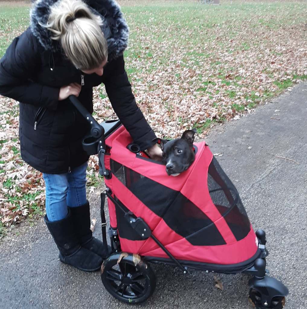 I picked Emma up from the hospital and we met her favorite volunteer Andrea who had made the hour plus drive to visit Emma and the pups over the past 2 weeks. We went to the forest preserve by the hospital and I placed Emma in a stroller and we walked the trials for over an hour. She popped her head out of the top and her nose was on overdrive taking in the fresh air and the scents coming from the forest where deer, rabbits, squirrels and other wildlife moved about in the tall grass beneath the trees.