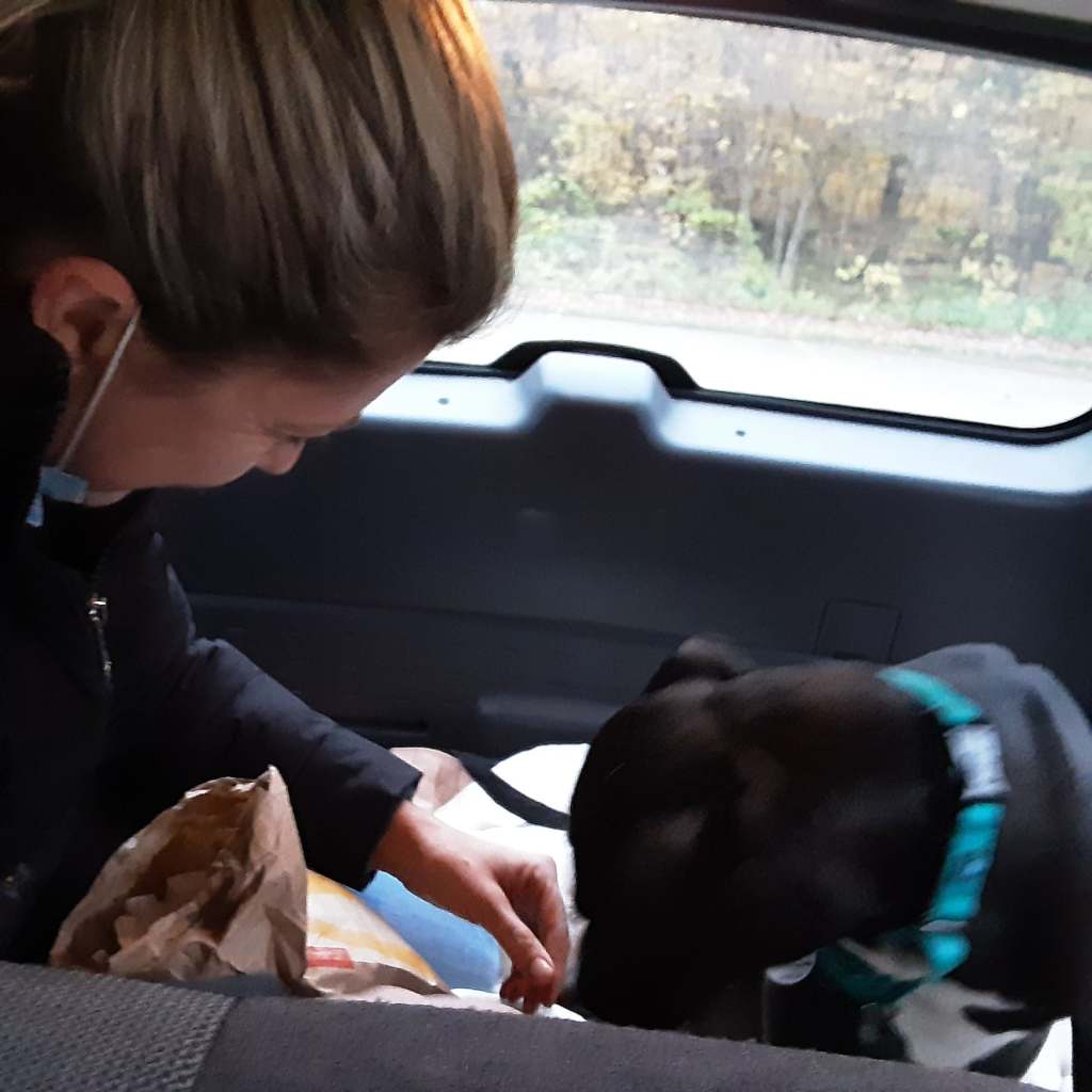 When we returned to the car, she kept looking inside the McDonald’s bag searching for another cheeseburger, so off we went to get her another. Her foster dad had arrived by the time we returned to the hospital and her tail wagged and wagged with joy. They shared a special bond as you can imagine.