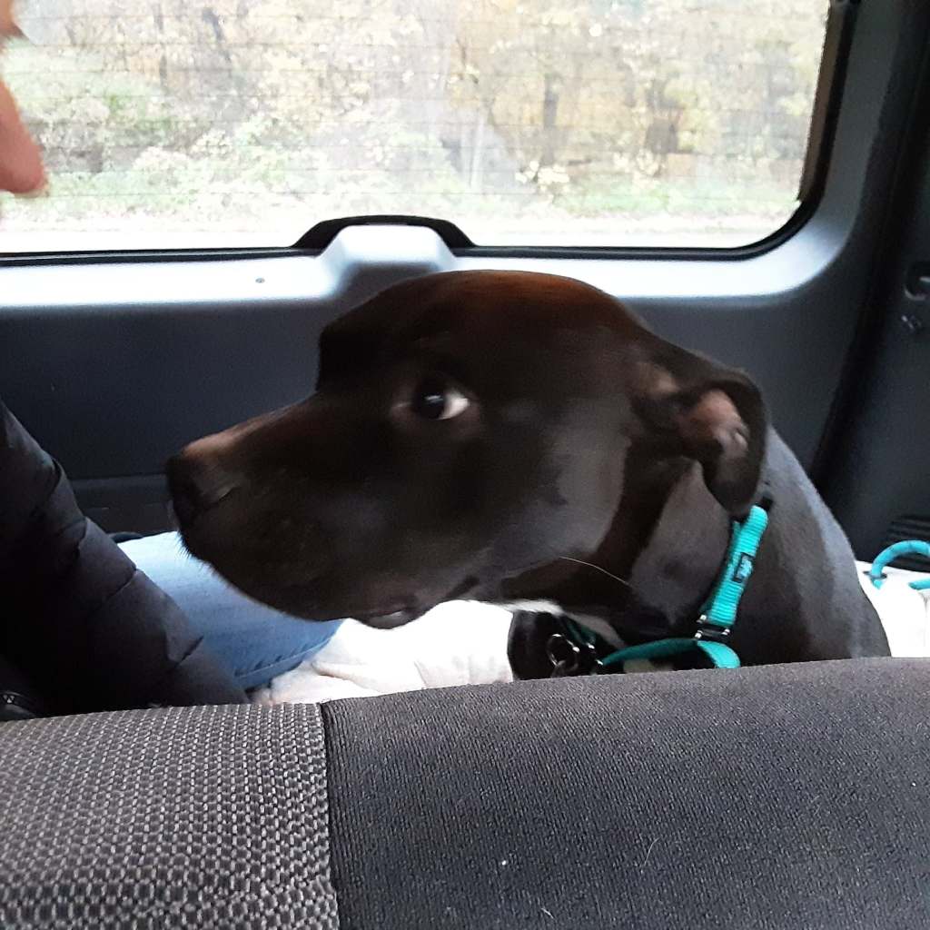 I met the transporter in Joliet, I purchased a freedom cheeseburger for her and then headed for my home. She sat down in the wash tub for her bath and allowed me to wash off the shelter grim without a fuss. Then it was off to her foster home, a normal 1 hour drive turned into a 2 hour drive with an accident blocking the highway. Not a peep came from her as she laid in her crate sucking on her blanket. She was a far more patient passenger than I was as her driver.