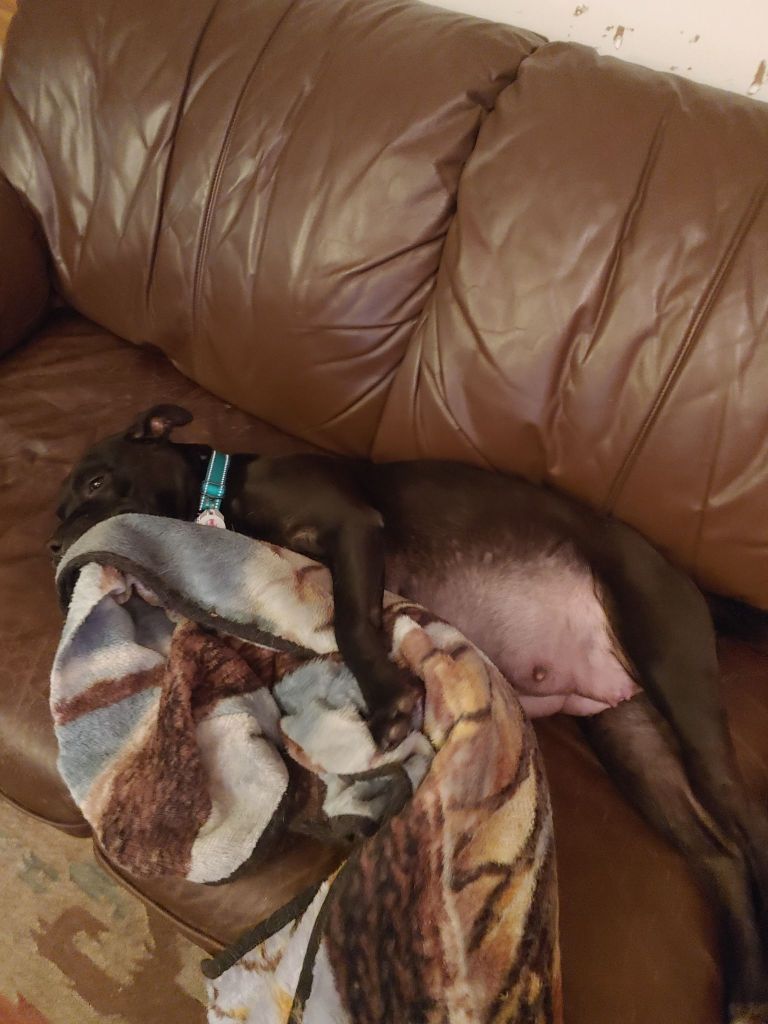 Late that night, her foster dad sent me a photo, there was Emma on the sofa with her blanket. She decided to bring it to the living room and curl up on the sofa instead of staying in her room. My heart was filled with gratitude that we were going to be the ones to give her a second chance at life and help her rear her pups.