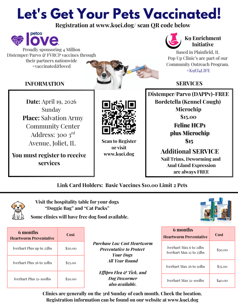 We will have the means to vaccinate 50 pets starting at 1:00pm and ending at 4:00pm. Working together we can have a very successful and safe clinic experience.