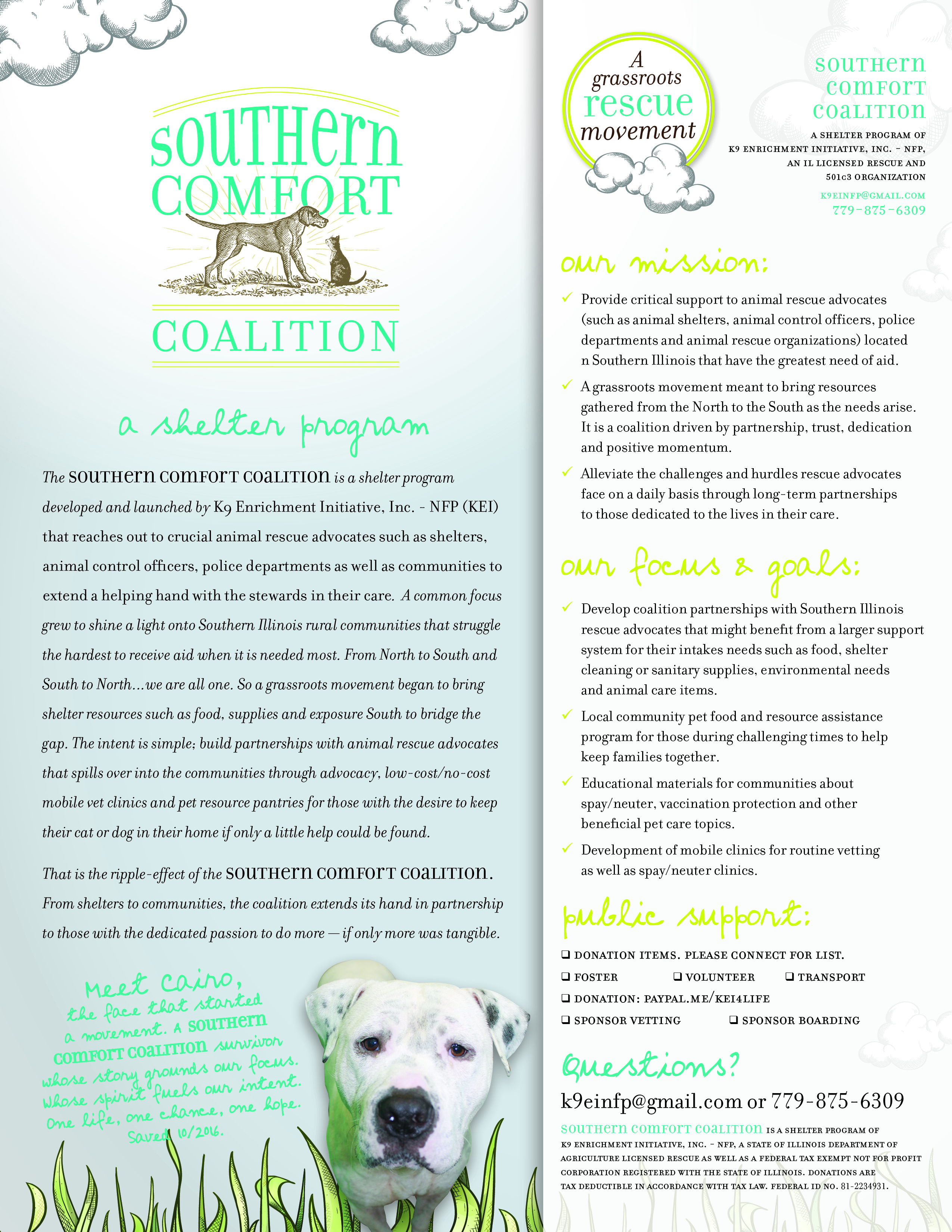 The Southern Comfort Coalition (SCC) is a shelter and community program developed and launched by K9 Enrichment Initiative, Inc. (KEI) that reaches out to crucial animal rescue advocates such as shelters, animal control officers, police departments as well as communities to extend a helping hand with the stewards in their care. A common focus [animal rescue] grew to shine a light onto Southern Illinois rural communities that struggle the hardest to receive aid when it is needed most. From North to South and South to North…we are all one. So a grassroots movement began to bring resources such as food, supplies and exposure South to bridge the gap. The intent is simple; build partnerships with animal rescue advocates that spill over into the communities through advocacy, low-cost/no-cost mobile vet clinics and pet resource pantries for those with the desire to keep their cat or dog in their home if only a little help could be found.